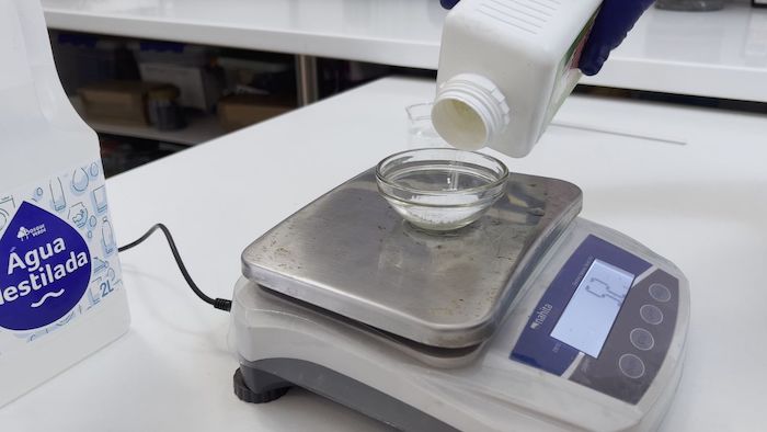1. Pese 10 g de NaOH e 90 g de água destilada. ( total: 100 g de solução.)